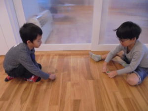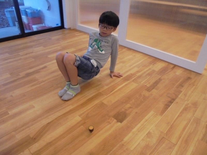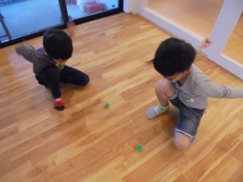 お兄ちゃん同士、真剣勝負でこま回し対決です。