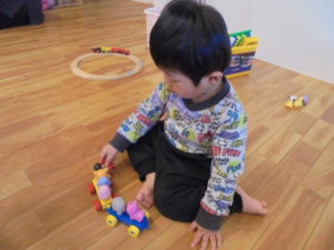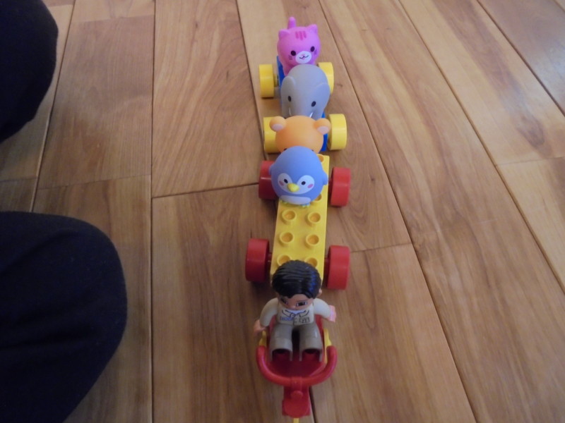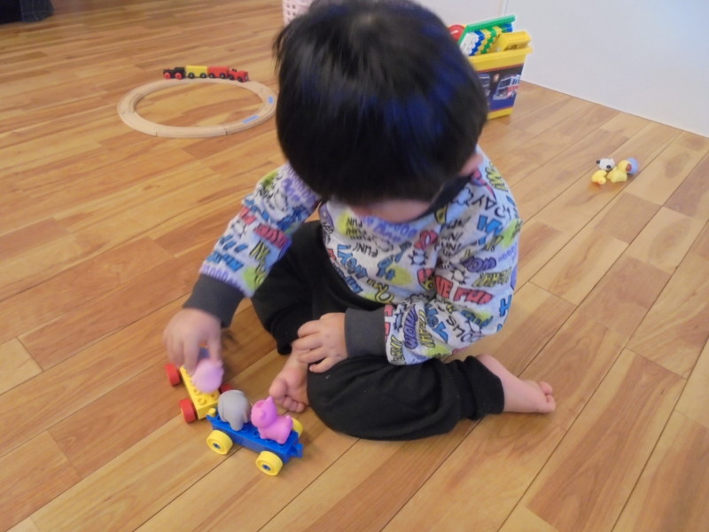 早速、お友だちがブロックで作った電車に動物さんを乗せていますよ。