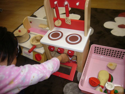 保育室便り何やらキッチンでお料理を始めましたよ!フライパン、お鍋にお野菜を入れて美味しそうに作っていますよ ![]()